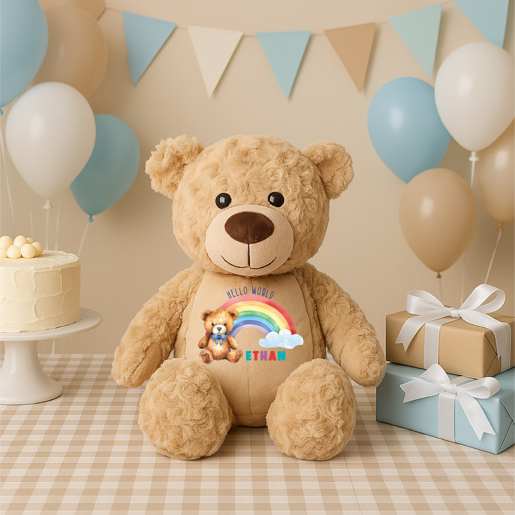 Welcome a new arrival with the Crafted Memories Personalised Teddy Bear. Standing at 40cm tall, this adorable plush stuffed animal features a charming Hello World rainbow design and can be customised with a baby’s name for a thoughtful keepsake. Soft, cuddly, and designed with love, this rainbow teddy bear makes a wonderful gift for newborns, baby showers, christenings, or first birthdays. With its bright rainbow motif and personalised touch, it’s more than just a soft toy – it’s a meaningful keepsake that parents and children will treasure for years.
